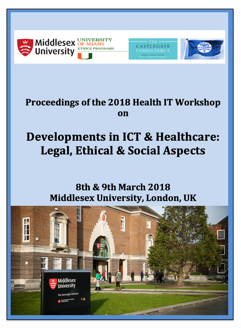 George, C., Whitehouse, D., Kenneth Goodman and Duquenoy, P. (eds.) 2018. Proceedings of the 2018 Health IT Workshop on Developments in ICT & Healthcare: Legal, Ethical & Social Aspects 8th & 9th March 2018 Middlesex University, London [Download Link]