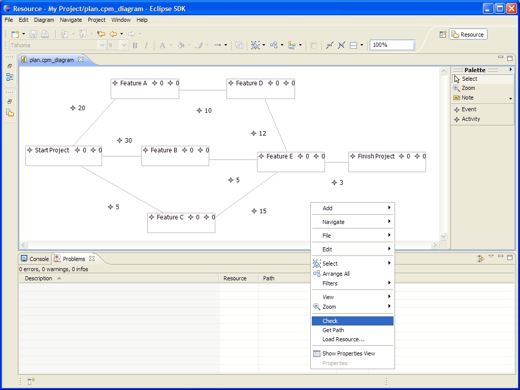 Armed with the knowledge of using Eclipse, EMF, GMF and XMF in to develop rich applications, this tutorial describes how this technology arsenal can be used to develop more complex applications. These applications center around the graph structure of nodes and edges commonly found in a wide spectrum of applications. It is often useful to ask questions or to analyze properties of graph structures. The first application in this tutorial calculates the optimum route between two nodes in a graph. The second application identifies the critical path between two nodes in a graph assuming that each edge is given a weighting, this type of application is often found in project planning software. This application also shows how XMF can be used to add constraints to a graph model to analyze whether key properties are observed.To top.